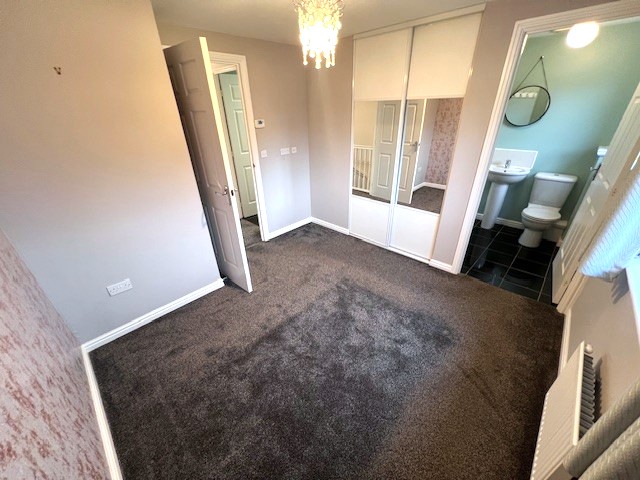 The accommodation comprises a bright lounge, contemporary kitchen with dining space and patio doors leading to the rear garden, downstairs WC, and a stylish family bathroom. The master bedroom benefits from an en-suite shower room, with two further well-proportioned bedrooms.